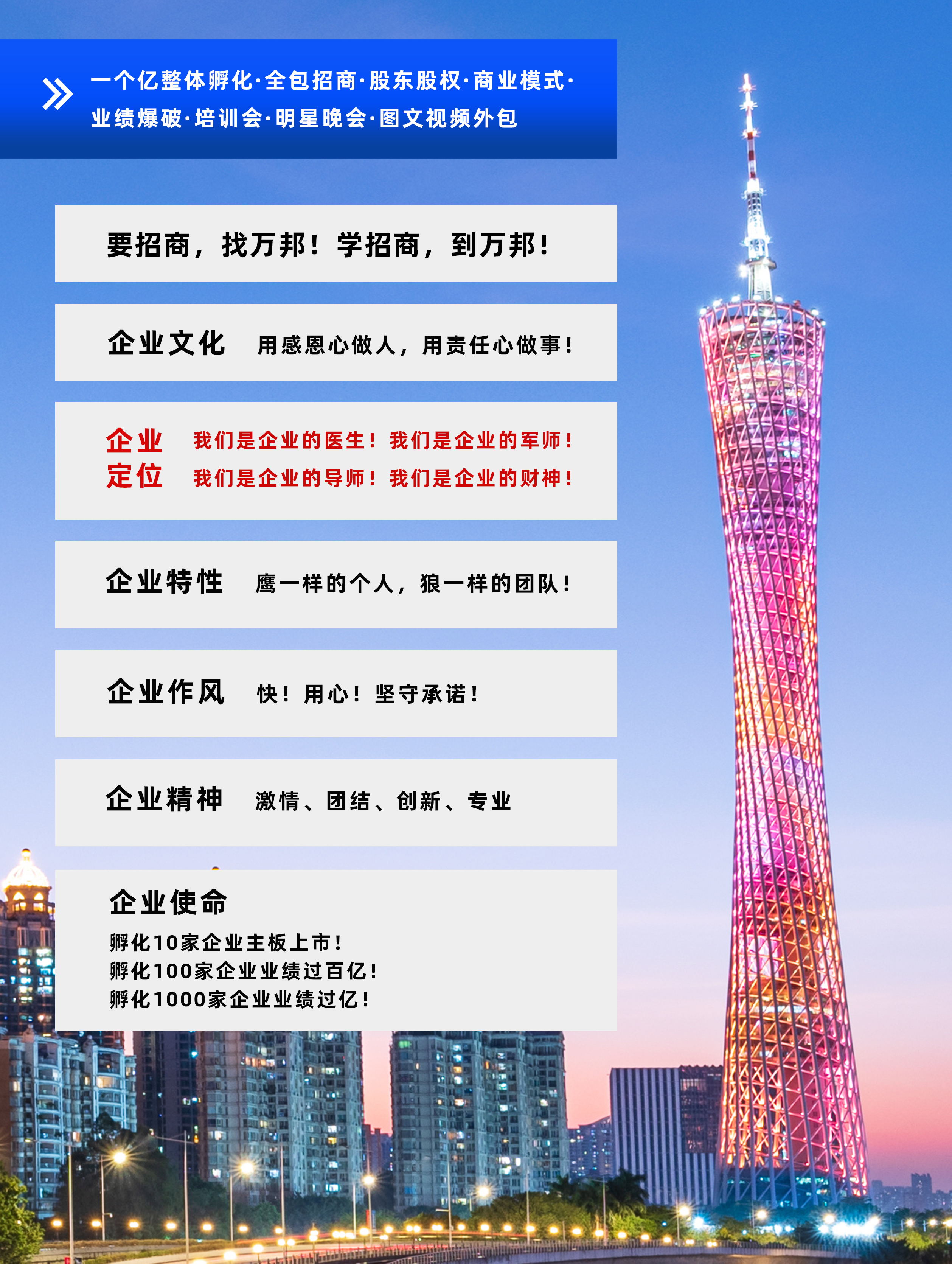 萬邦集團成立于2003年6月,專注于為企業(yè)進行招商和整體孵化,包含公司診斷、產(chǎn)品定位到量身打造商業(yè)模式系統(tǒng),再到投人、投錢、投資源,一起干的分紅股東招募,鐵血軍團的打造,全國招商會議,為企業(yè)建立一套完善;成熟的招商系統(tǒng),教育系統(tǒng)、培訓(xùn)系統(tǒng)。